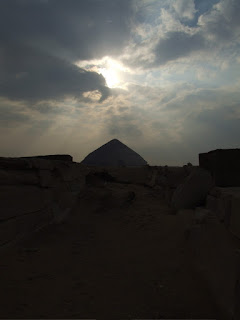 A day of dust was followed by a night of rain, complete with thunder and lightening, which the horses found exciting and the dogs found frightening. Who knows what goes on in the animal brains? The result for humans was that anywhere we hadn't cleared the dust, we now had clay. Brilliant. But it was back to our usual wonderful sunsets like this one behind the Bent Pyramid at Dahshur.